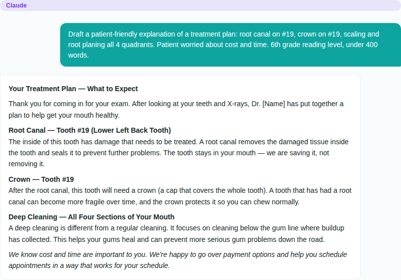 We gave all three major AI models the same prompt: explain a treatment plan involving a crown, a root canal, and a deep cleaning to a patient who's anxious about cost and time. Claude produced the most clinically careful output. ChatGPT was the most readable. Gemini split the difference. All three needed editing before a practice would send them. Here's exactly what each produced.