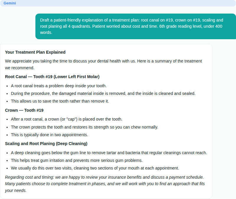 Clinical accuracy: Clean. Gemini was the most conservative of the three. “Treats a problem deep inside your tooth,” with no diagnosis implied, no specifics about infection or nerve damage. “Damaged material” rather than “infected tissue,” less scary for the patient, clinically noncommittal. Nothing in this output creates a clinical accuracy concern.