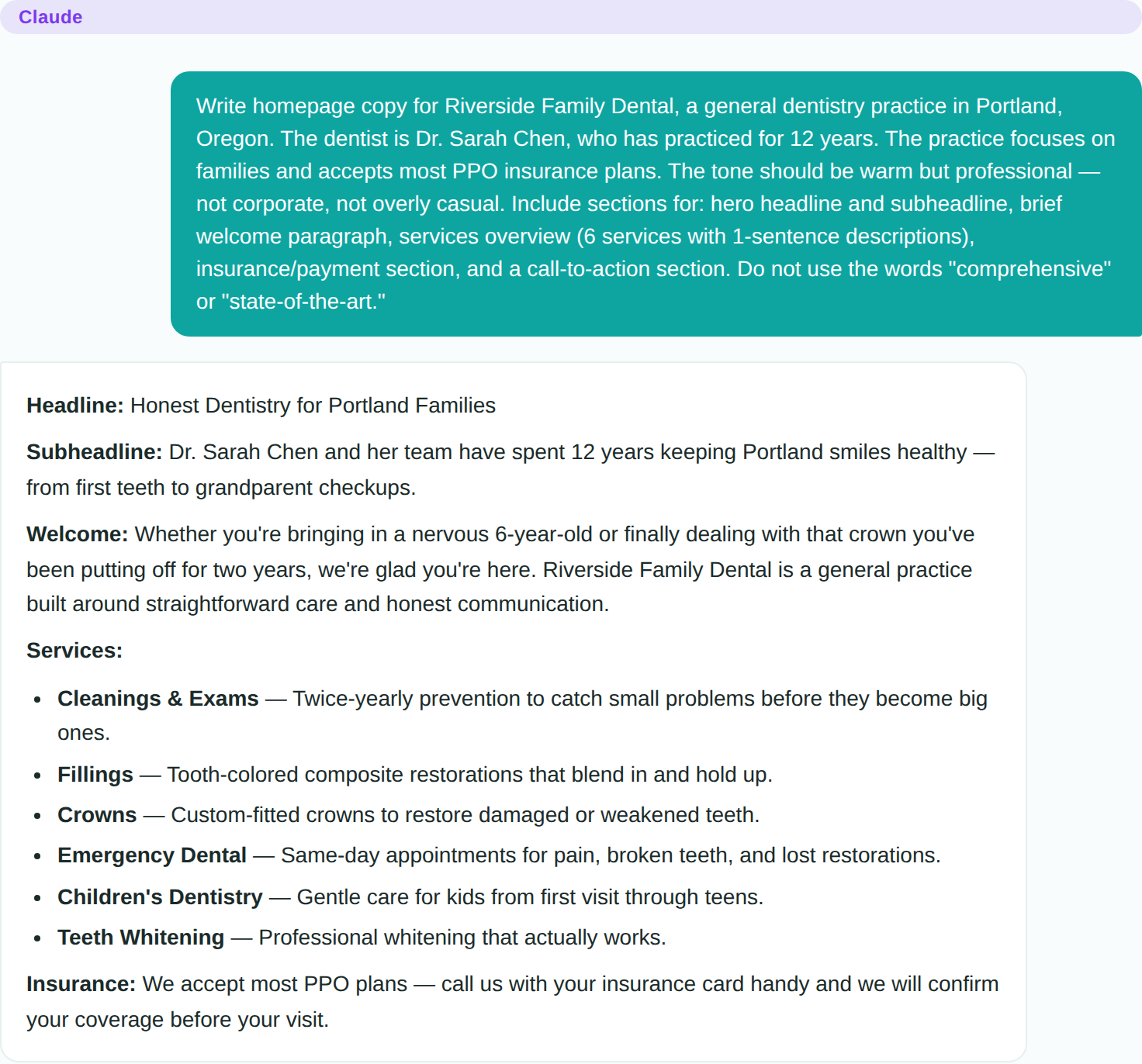 Homepage copy for a dental practice follows a predictable structure: headline, value proposition, services overview, trust signals, call to action. Claude handles this well because the pattern is consistent across thousands of dental websites.