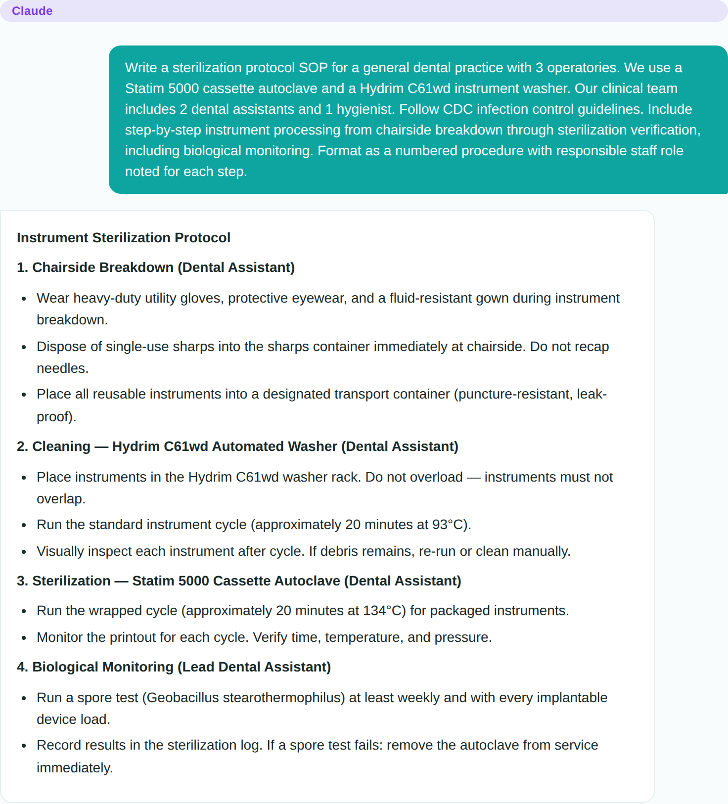 Have your clinical lead review. No AI-generated clinical document should go into use without review by someone who actually performs the procedure. The lead hygienist reviews the sterilization and clinical protocols. The office manager reviews the administrative workflows. The dentist/owner signs off on everything.